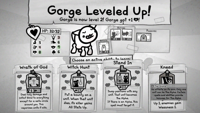 Mewgenics не использует видимую шкалу опыта. После каждого боя уровень одного кота автоматически повышается. Система отдает приоритет коту с самым низким уровнем, выбирая случайным образом, если есть ничья.